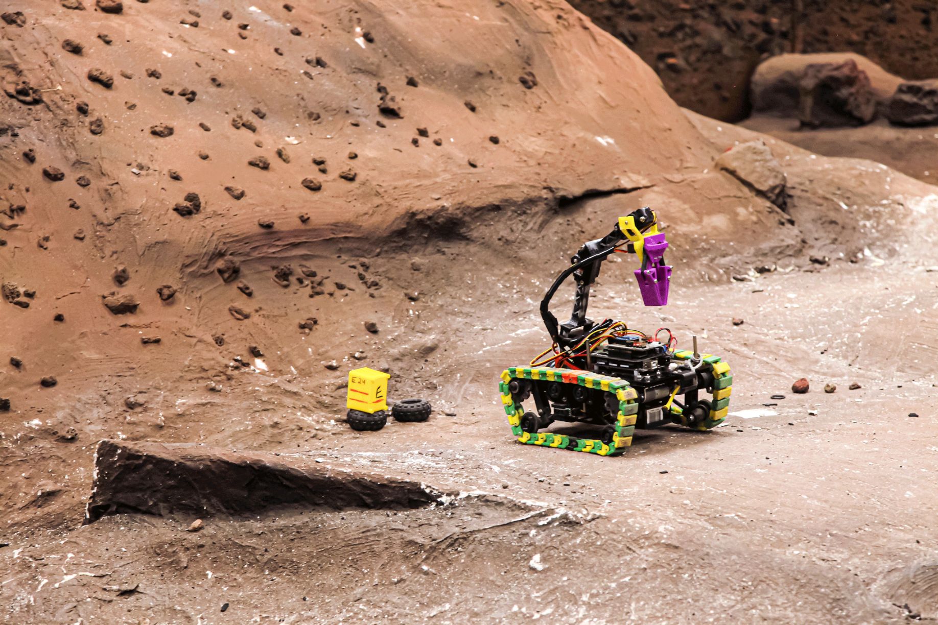 Learn programming concepts and challenges in preparation for the Mars surface mission. The final challenge unfolds on our expansive 16ft x 16ft Martian surface replica, featuring iconic landmarks like Olympus Mons and Schiaparelli Crater and other craters and valleys.
