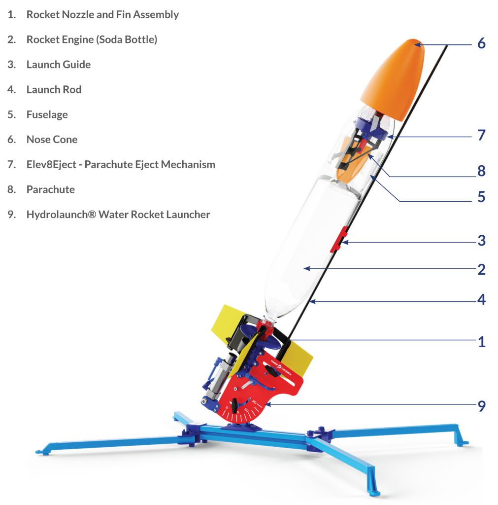 The HydroLaunch Water Rocket System is not a basic water rocket – it is a complete solution for implementing science and engineering practices (SEPs) in the K-12 classroom. Whether it is the introduction of mechanical complexities that enable students to engage in hands-on engineering of a water rocket, or the planned deployment of a parachute with precision, students become NASA engineers in their launch mission. The HydroLaunch Water Rocket System also requires students to consider and compare the effects of a multitude of variables upon their rockets: rocket mass, air pressure, water volume, nozzle size, fin shape and more. Some of the salient features are: