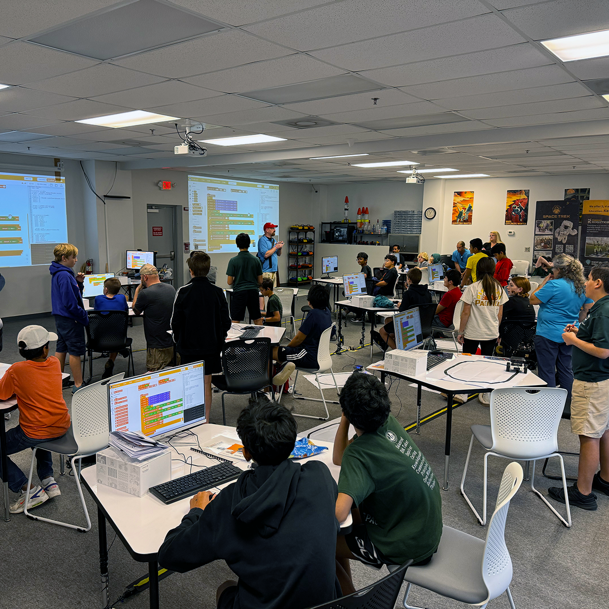 On the rocketry side, students learn the basics of rocket science and the physics of flight, then work in launch-team roles to design and build a water rocket using custom parts. Teams test performance concepts, iterate like real engineers, and finish with a mission debrief and graduation—building confidence, teamwork, and problem-solving skills along the way. Plus, students explore Kennedy Space Center exhibits linking lessons to spaceflight.